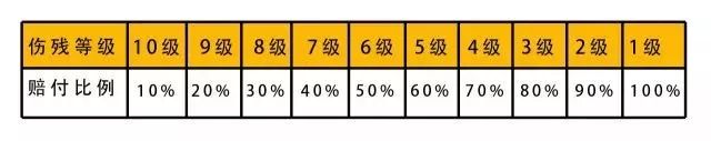 意外伤残保障的内容依据行业发布的《人身保险伤残评定标准》,分为1-10级,8大类共281项。伤残赔付比例与伤残等级相对应,具体如下:#p#分页标题#e#