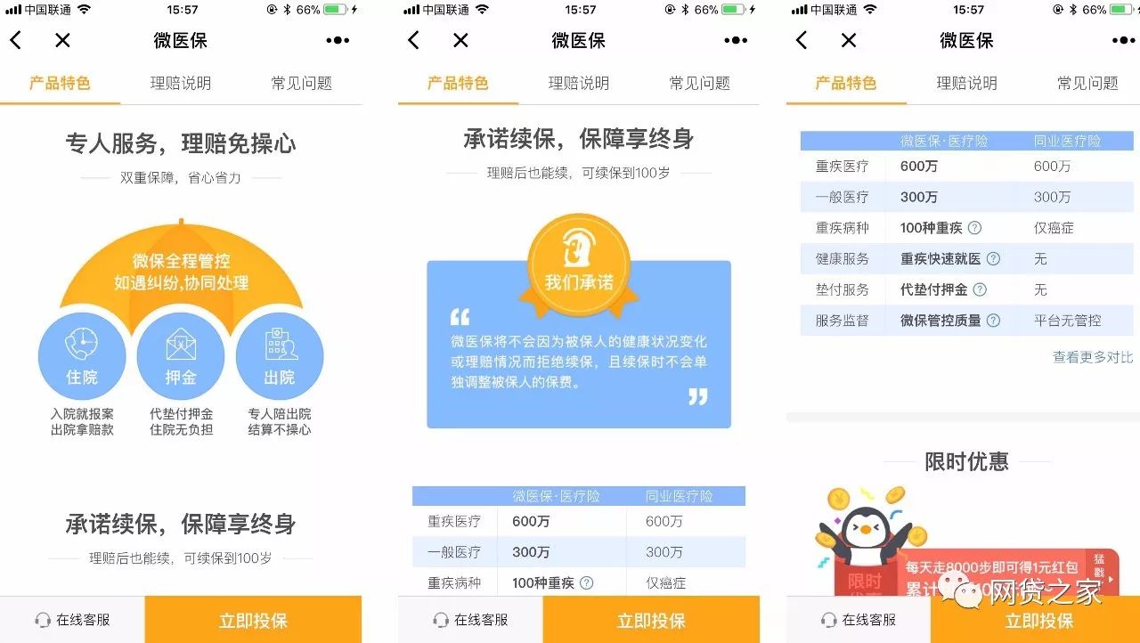 “保险服务”点开第一屏就是介绍同步上线的保险平台——微保WeSure,平台目前仅推出首款产品——“微医保·医疗险”(以下简称“微医保”)。该款由微保与互联网保险公司“泰康在线”合作的健康险产品,最低只需百元保费就能获得600万保额,还提供重疾相关的快速就医服务,包括在全国36个城市公立医院提供住院押金垫付服务等。