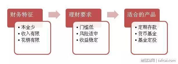 根据大学生的财务特征,相应适合的理财投资产品应该具备的特点是:门槛低、风险适中、收益稳定。对应的几种产品有:定期存款、货币基金、基金定投。