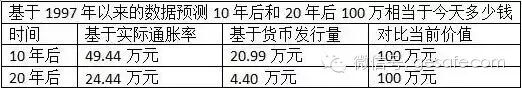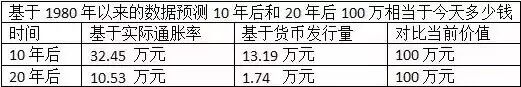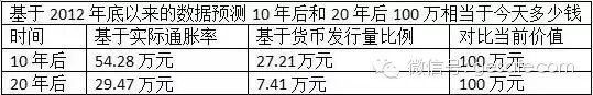 如果按照占货币发行量的比例计算,现在的100万元,在10年之后的财富比例可能相当于今天的13万元到35万元之间;20年后的财富比例可能相当于今天的2万元到19万元之间。